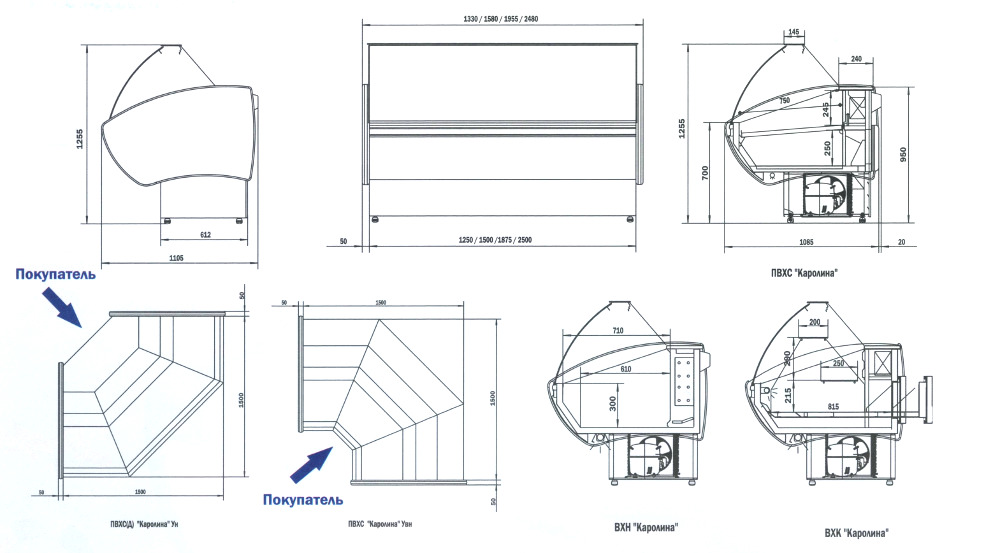 | Длина витрины габарит (с боковинами), мм. | 1330 | 1580 | 1955 | 2480 |